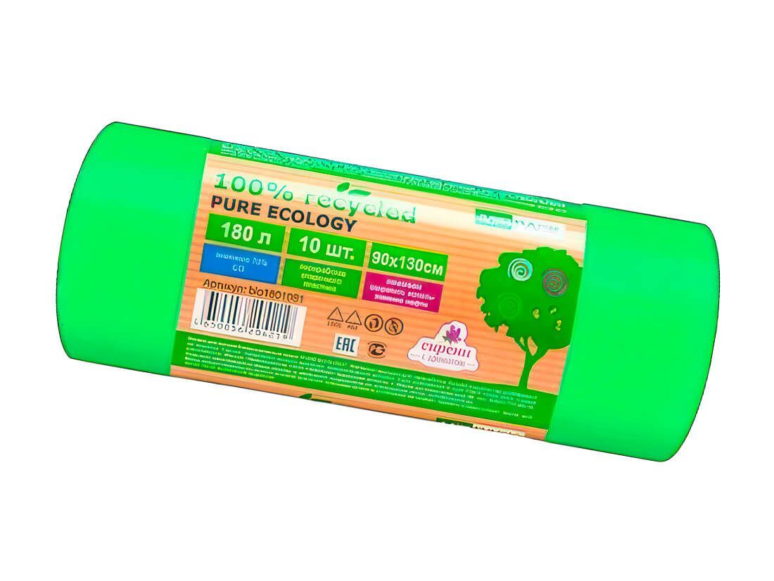 Мешки для мусора 180 л, ароматизированные, биоразлагаемые, зеленые, в рулоне 10 шт., ПВД, 40 мкм, 1300х930 мм, PURE ECOLOGY, bio1801081
